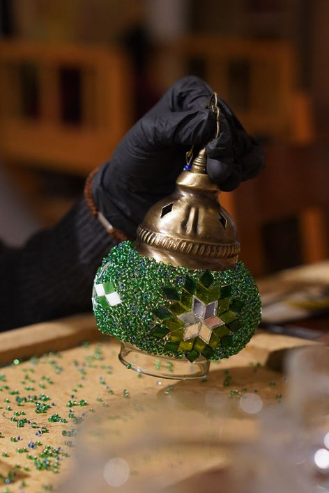 Belirlenen desenler doğrultusunda renkli mozaik camlar ve boncuklar, özel yapıştırıcılar yardımıyla titizlikle cam küreye işlenir.